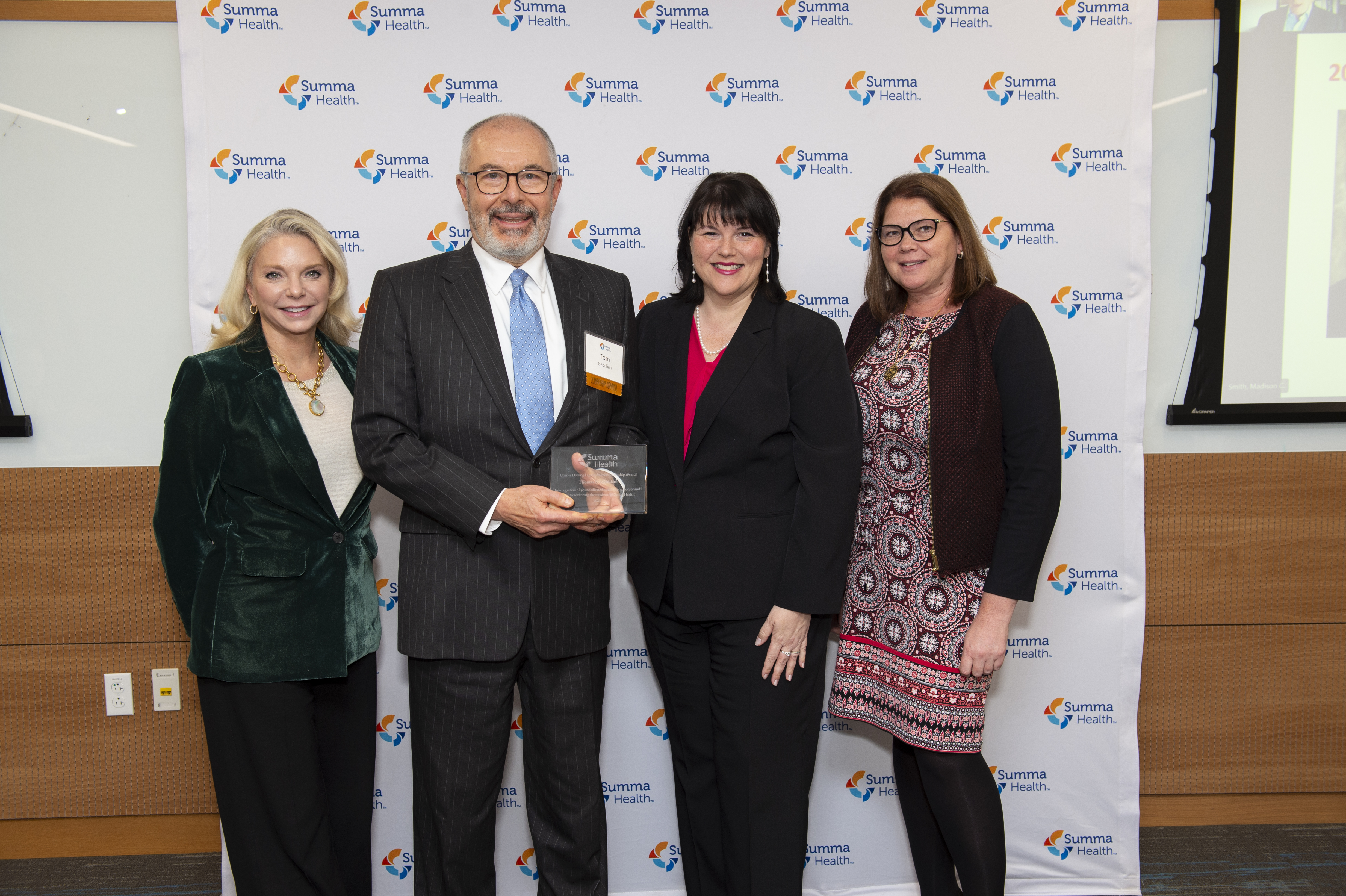 Above: Tom Gedelian is presented with the 2023 Charles Deering Legacy Advisor Leadership Award. From left, Julia Rea Bianchi, Summa Foundation Board chair; Tom Gedelian; Jessica Hudson, Summa Foundation president and Summa Health chief development officer; and Naomi Ganoe, Summa Health Charles Deering Legacy Advisor Leadership Council chair.